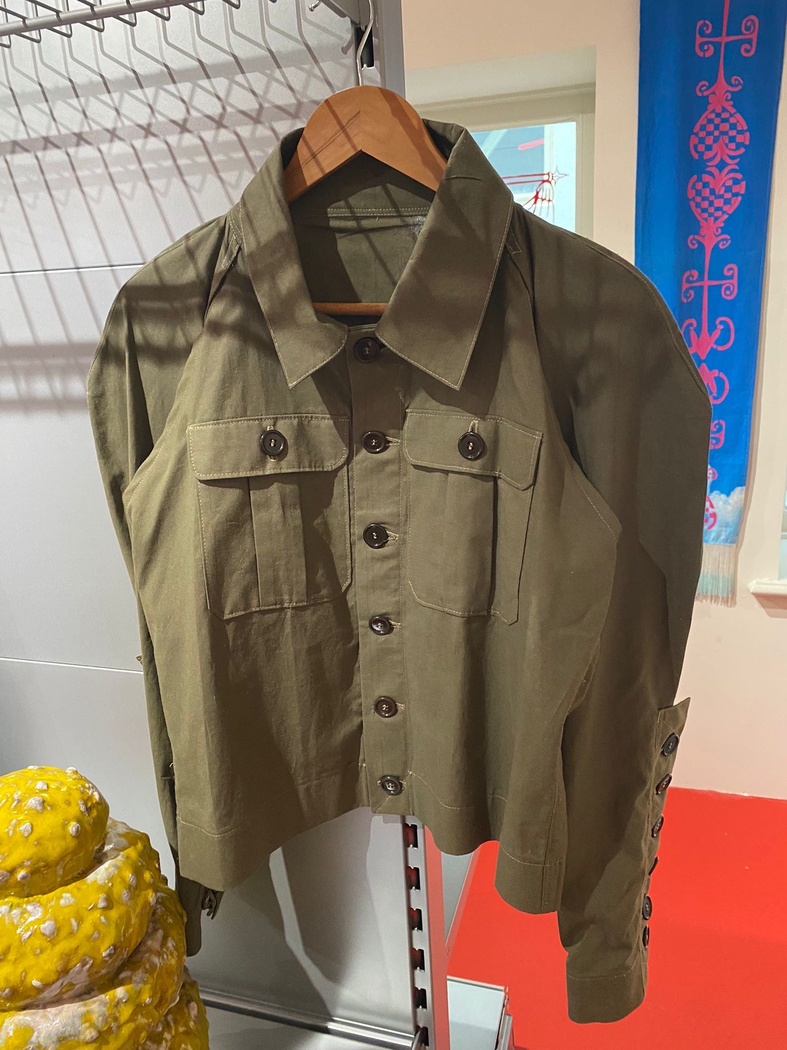 Jacket inspired by the ww2 German trenchcoat. Open armhole, braided arm details, premium cotton, boxy fit.