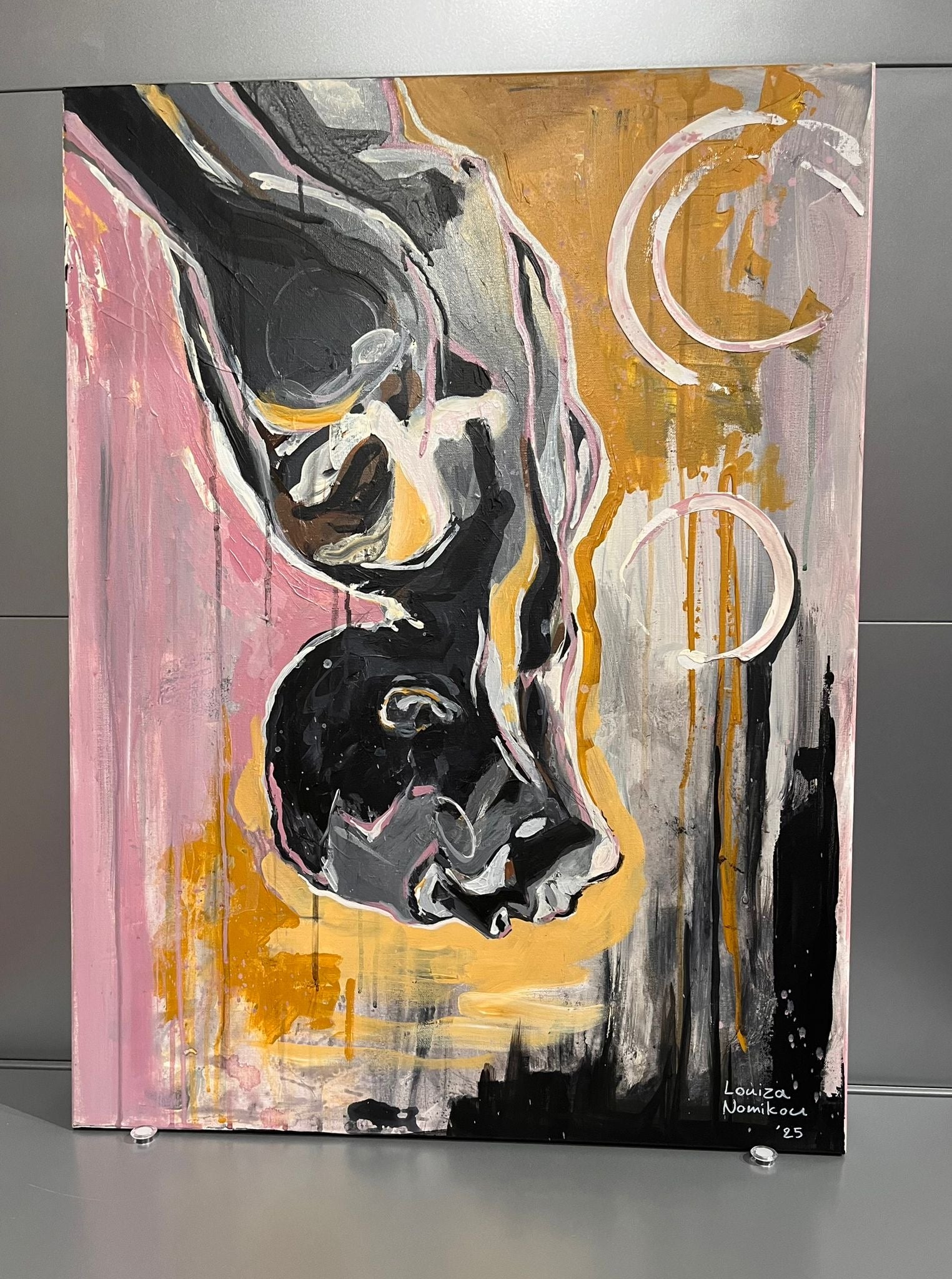 Mixed media, acrylic paint, ink. Intention of depicting motion.