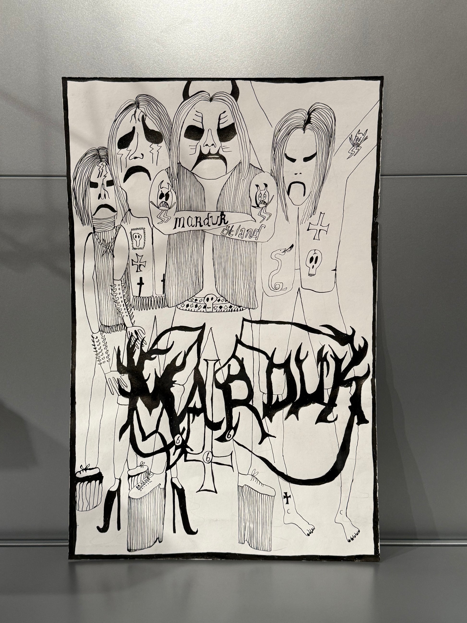 Original drawing, ink on paper. Drawing of a metal band he made for the first collection of De band shirts. De Bandshirt is a collective that celebrates music and drawings and fandoms, we make Bootleg Bandshirts since 2020.