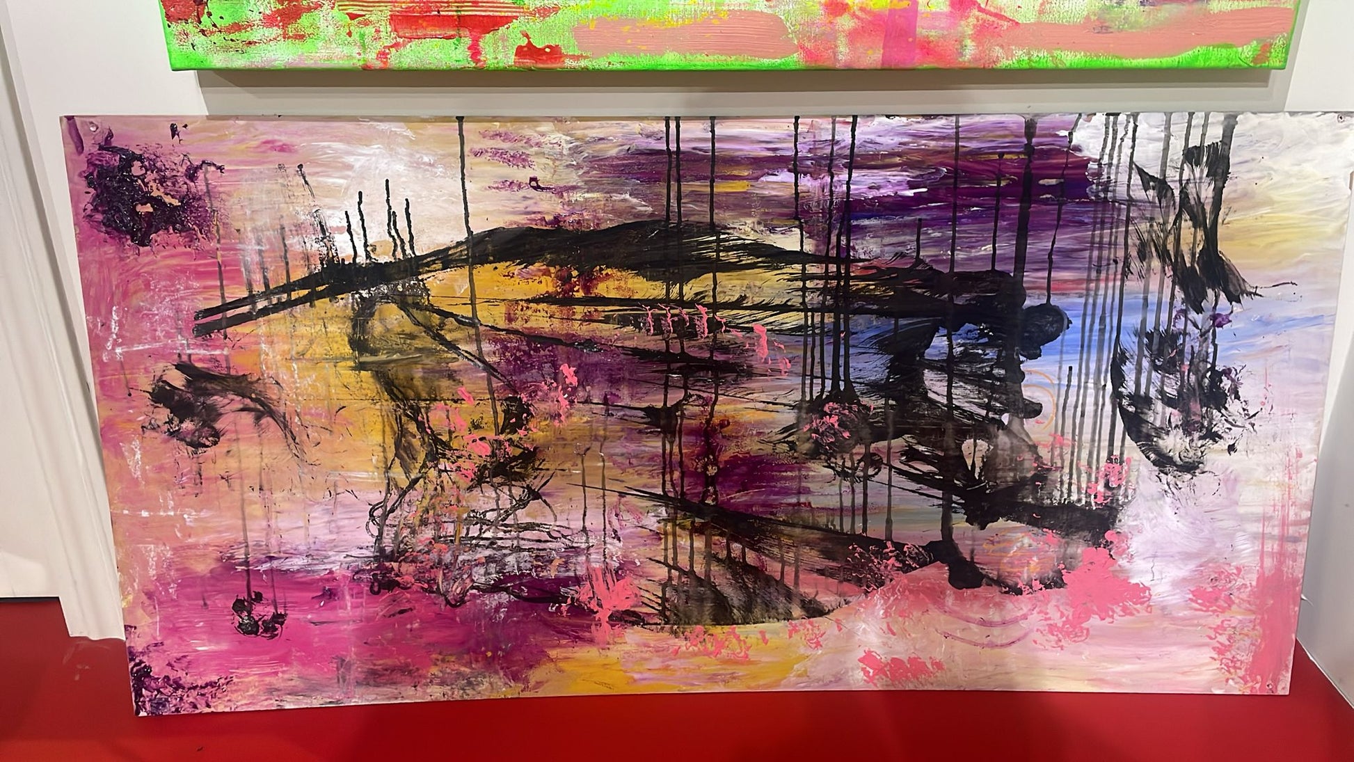 Expressive artwork of 2 collaborative artists that fell in love shortly after creating this piece. Mixed media on repurposed material.