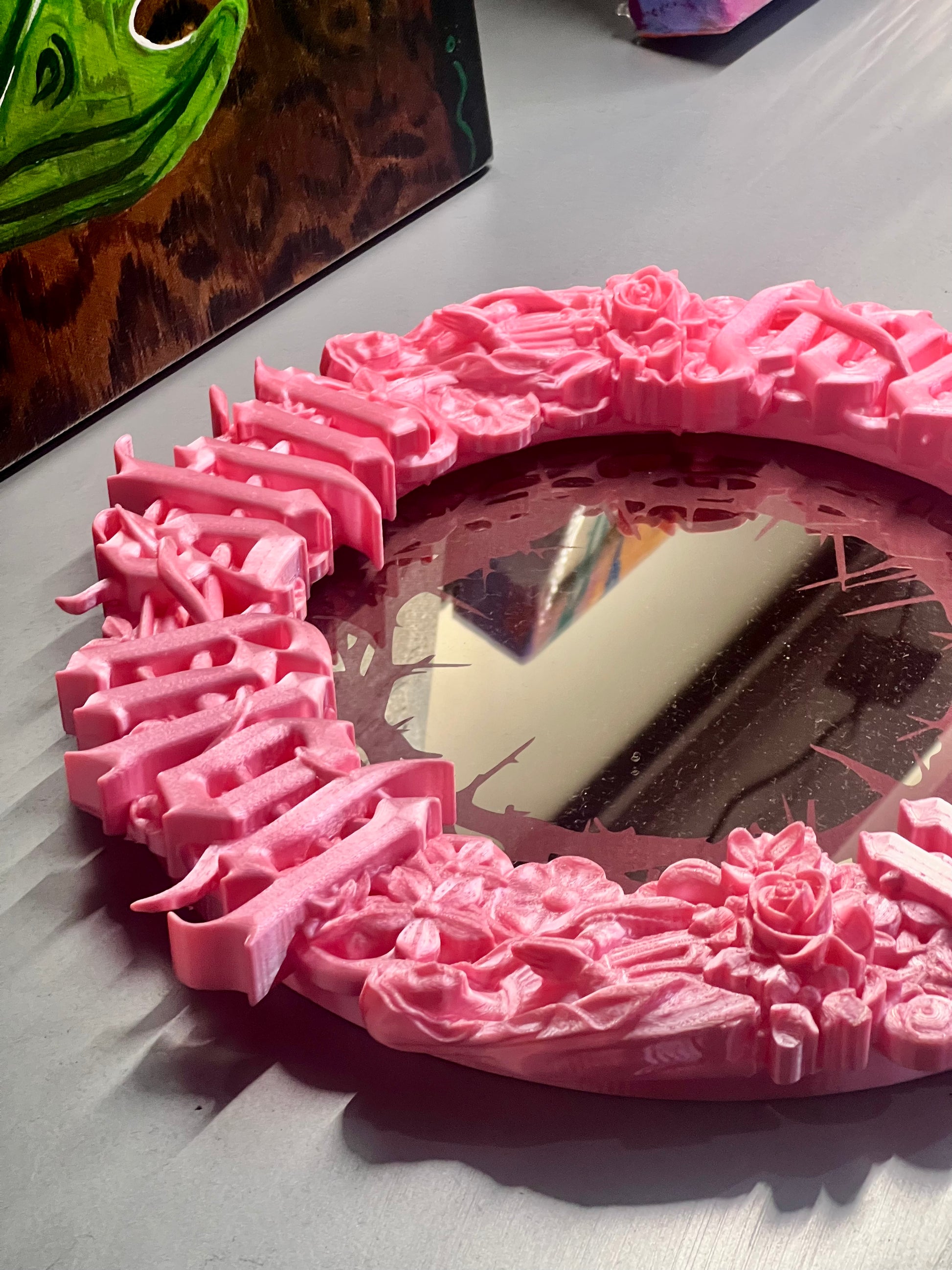 The artist draws inspiration from religious and gothic imagery. Asks sugar coated life size questions. 3D printed and lasered mirror.