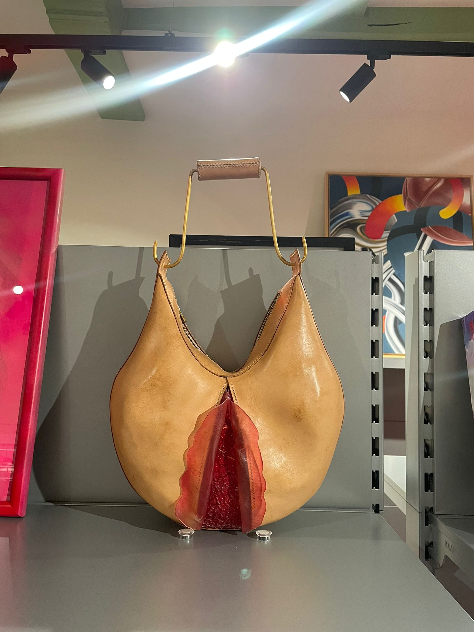 This work is based on research into a pig slaughterhouse, and by creating a handbag-shaped sculpture, it represents what leather bags are actually made from
